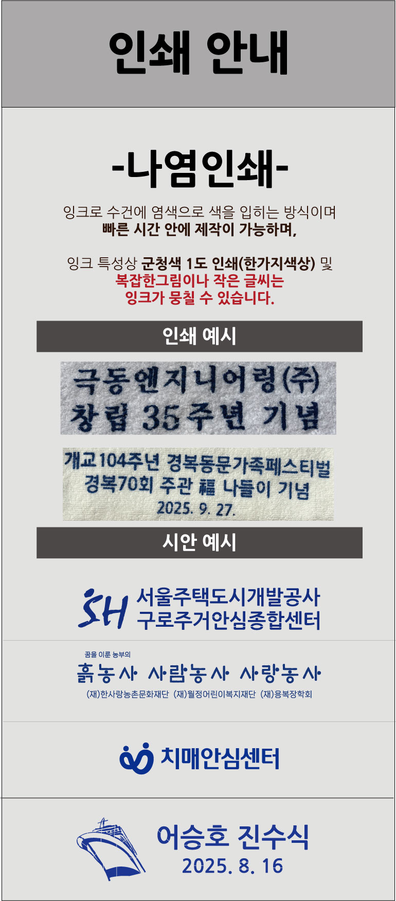 - Àμ⸦ ÇϽô °æ¿ì, ´ç»ç¿¡¼´Â °í°´´ÔÀÌ º¸³»ÁֽŠ¿ø°í ¹× µµ¾ÈÀ» ±âº»À¸·Î ÇÏ¿© Çʸ§À» Á¦ÀÛÇϰí, Á¤È®¼ºÀ» ±âÇϱâ À§ÇØ °í°´´Ô°ú ÀçÈ®ÀÎ ÈÄ ½ÇÁ¦ Àμâ ÀÛ¾÷À» ÇÕ´Ï´Ù. (ÃÖÁ¾ µðÀÚÀÎ ½Ã¾ÈÀÇ À߸øµÈ È®ÀÎÀº Ã¥ÀÓÀÌ ¼ö¹ÝµÇ¹Ç·Î Á¤È®ÇÏ°Ô È®ÀÎÇÏ¿© Áֽñ⠹ٶø´Ï´Ù.)